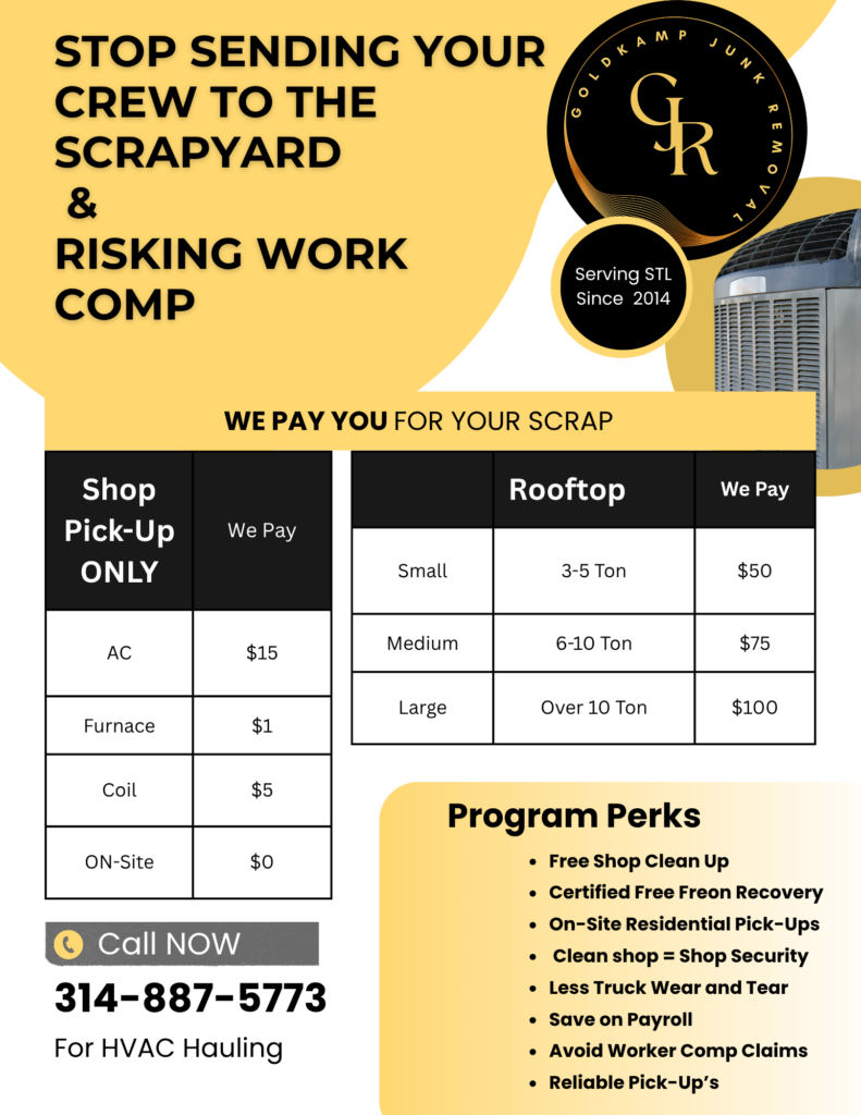 At Goldkamp Junk Removal, we partner with HVAC companies to provide fast, reliable hauling of old HVAC units and equipment, including full refrigerant recovery and proper disposal. We help streamline your jobs by handling the heavy lifting and removal, reducing wear and tear on your trucks and helping lower the risk of workers’ comp claims for your team.